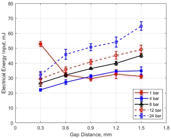 Electrical energy input vs. gap for different pressures, for a dwell time of 4 ms.