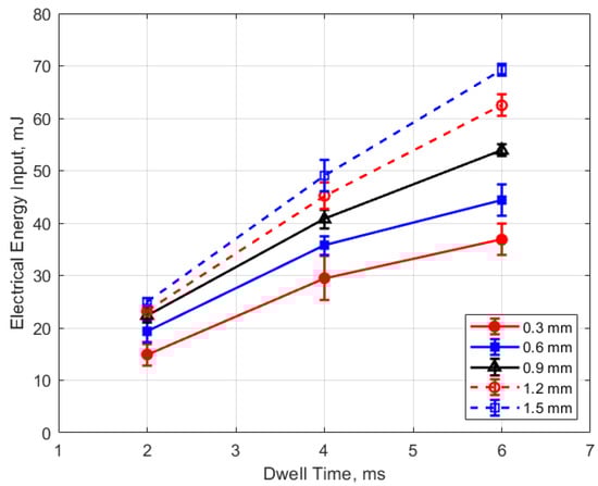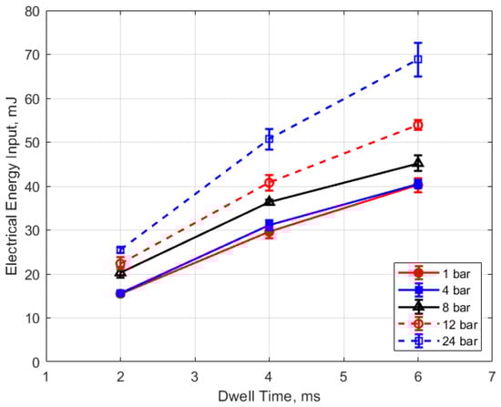 The electrical energy delivered to the gap as a function of dwell time is shown in Figure 17 and Figure 18. As expected, a longer dwell time leads to greater electrical energy storage in the secondary side of the coil and, consequently, more energy delivered to the gap. It is interesting to note the range of delivered electrical energy to the gap as parameters changed; delivered energies ranged from approximately 15 to 70 mJ. The literature shows minimum ignition energies for stoichiometric hydrocarbon-air mixtures that are in the range of 0.3–2 mJ [17].