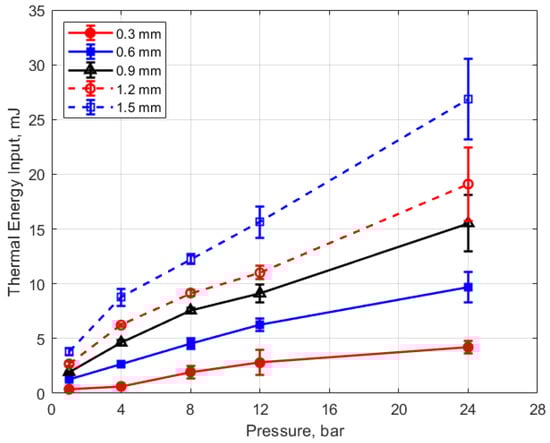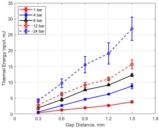 where E is the thermal energy to the gas in mJ and P is the gas pressure in bar. For the pressures shown, the value of the constant in Equation (4) is in the range of 0.2–0.4 mJ/bar, with an average close to 0.3 mJ/bar. Using this average value of 0.3 mJ/bar and rearranging Equation (4) as a differential, one obtains the following relationship for the differential change in the normalized thermal energy deposition with gas pressure that is independent of gap distance.