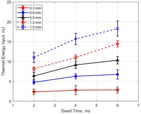 Figure 21 and Figure 22 show the thermal energy deposition as a function of dwell. A longer dwell time results in more electrical energy delivered to the gap, so the observed trend of increasing thermal energy deposition with increasing dwell time would be expected.