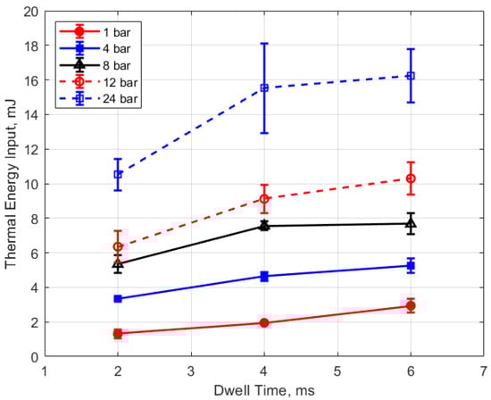 Thermal energy input vs. dwell for different pressures, for a 0.9 mm gap.