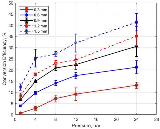 Finally, the conversion efficiencies of electrical energy to thermal energy delivered to the gap are shown in Figure 23, Figure 24, Figure 25 and Figure 26. Figure 23 shows the conversion efficiency as a function of initial gas pressure for the different gap distances. Conversion efficiency increased monotonically with gas pressure, but the dependency was not linear.