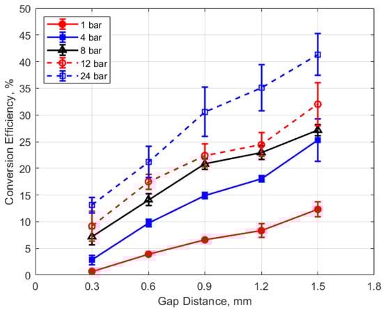The degree to which the conversion efficiency increased with gas pressure was quite striking. At a pressure of 1 atm and for the smallest gap distance of 0.3 mm, the conversion efficiency was less than 1%, whereas with the largest gap of 1.5 mm and at the highest gas pressure of 24 bar, the conversion efficiency was over 40%. The rate of increase in the conversion efficiency with pressure tended to diminish with increasing pressure, in contrast to the thermal energy deposition for which the rate of increase showed an increase with increasing gas pressure.