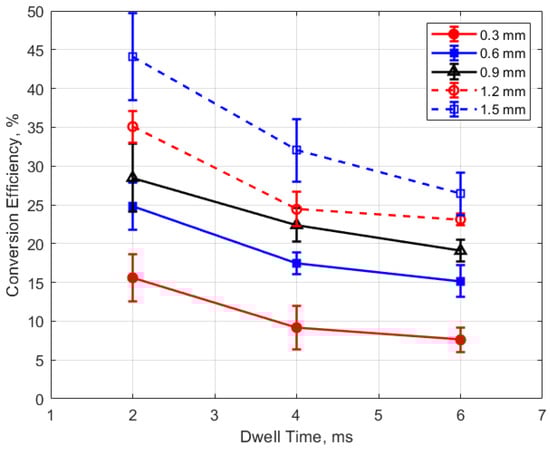 The conversion efficiencies versus dwell time are shown in Figure 25 and Figure 26. A long dwell time results in greater electrical energy supplied to the gap. However, it is interesting that, in general, the efficiency of electrical-to-thermal energy conversion diminished with increasing dwell time. The reason for this is not clear, but longer dwell time resulted in longer spark durations and, consequently, more time for heat transfer to occur.