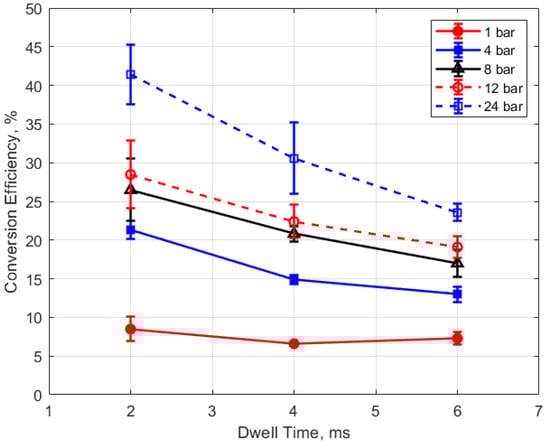Conversion efficiency vs. dwell for different pressures, for a 0.9 mm gap.