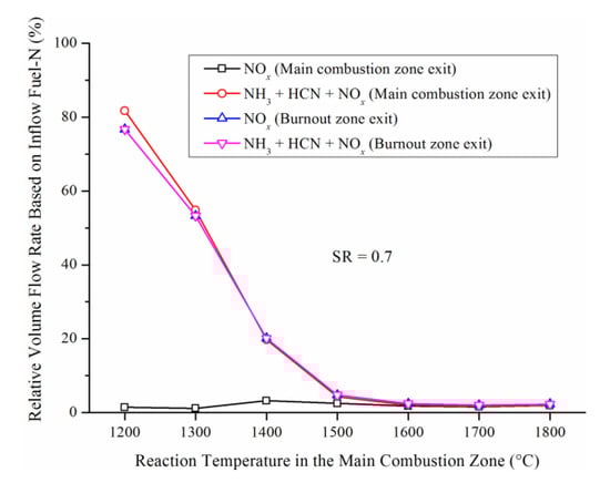 The sums of NH3, HCN, and NOx at the main combustion zone and burnout zone exits in staged air combustion are shown in Figure 5. At the main combustion zone exit, the NOx emissions are low, while the sum of NH3, HCN, and NOx is quite high when the reaction temperature is set as 1200 °C. A large amount of NH3 and HCN remain in the primary combustion exhaust. With the secondary gas introduced, the remaining NH3 and HCN are almost entirely oxidized to NOx. Therefore, at the burnout zone exit, very little NH3 and HCN exist, and the sum of NH3, HCN, and NOx is approximately equal to the NOx emissions. The final NOx emissions depend on the sum of nitrogen compounds in the primary combustion exhaust. To limit the NOx emissions as much as possible by air staging, it is of great significance to obtain a minimum sum of NH3, HCN, and NOx in the main combustion zone, i.e., converting more fuel-N to N2 in terms of N balance. With the reaction temperature in the main combustion zone rising, the final NOx emissions decrease. When the temperature is higher than 1600 °C, the final NOx emissions attain a minimum level.