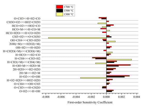 First-order sensitivity analysis for N2 at different temperatures in air combustion (SR = 0.7).