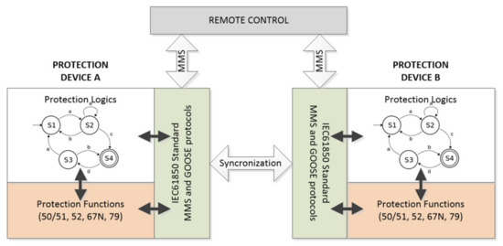 This section provides the background for the rest of the paper. The first step is the definition of a standard set of protection functions that must be implemented in the protection devices. Each of these protection functions is able to detect a specific fault type. When a fault event occurs, it has to be properly handled by the protection logics, which is the second key point of the presented approach. To synchronize the trip actions along the feeder, all protection devices must exchange information. This data exchange is realized in the third block of the model-based approach presented here, the standard IEC 61850 and its protocols. The combination of these three blocks is depicted in Figure 2.