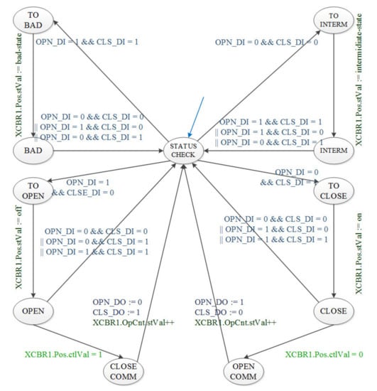 - A3 raises the operate signal (“OPER” state), and it starts the opening of the breaker, sending to it the opening command (XCBR1.Pos.ctlVal:=1) (“OPEN COMM” state).