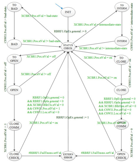 - A2 oversees the failure of the breaker after a command is received. It propagates the command to A1, waiting to see a change in the CB interface. If nothing happens, after the time RBRF1.FailTmms.setVal expires, it notifies a failure of the breaker operation changing the RBRF1.OpEx.general value. This alarm is maintained until the next control action. It is worth recalling that, in all the automata diagrams shown in the paper, the notation “#LN.DO.DA” is used to specify that the transition from a state S1 to a S2 occurs after a fixed number of milliseconds equal to the value of that specific Data Attribute