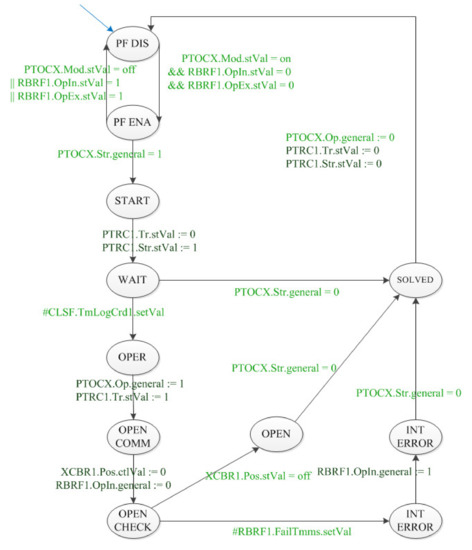 - In the “SOLVED” state, the fault has been solved with the opening of the breaker. The automaton checks that the operating signal is set to zero by the external function which has detected the fault (PTOCX.Op.general = 0). Then, the automaton restarts from the “PF DIS” state, checking if the protection function has been disabled during the execution of the logic.