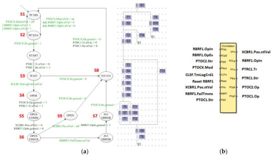 Figure 9a shows the correspondence between the chronometric selectivity automata and the SFC corresponding automata. A library block with input/output assignments has been created for each SFC diagram so that the user can easily create a program with several instances of the same automata, one for each line to be monitored in the substation (Figure 9b).