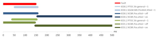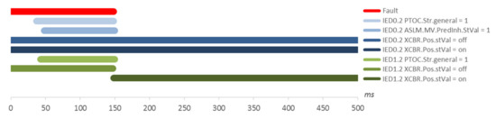 Circuit Breaker Operation Fails. The last set of tests is aimed at evaluating the behavior of the automation system when the logic selectivity fails due to a breaker operation failure, thus requiring the chronometric selectivity of the upstream IED to step in. Figure 13 shows the expected behavior in this scenario in accordance with the settings that have been configured. The basic steps of the two IEDs are the same as the previous cases. The block signal by IED1.2 to IED0.2 is sent and received, so IED0.2 goes to the “block” state of the automaton A3, waiting for the fault to be solved by the blocker IED. The chronometric selectivity automaton of IED0.2 (A4) is in the “wait” state. IED1.2 sends the trip to its breaker, but the breaker does not open, so the fault current is not interrupted. After the fixed time CLSF1.TmLogCrd1, IED0.2 determines that chronometric selectivity must solve the issue; therefore, it opens the breaker.