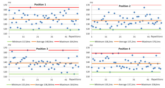 Figure 11 shows the time performance of the system to operate the circuit breakers in case the faults are in positions 1–4, respectively. Per each fault position, the test has been repeated 50 times. PTOCx.OpDiTmms has been selected as 100 ms and, since the time required by the IED module to determine the overcurrent direction is about 40 ms (two full wave cycles), the expected operation time is around 140 ms. The average value is the same since the operation setting for the logic selectivity is the same in all locations.