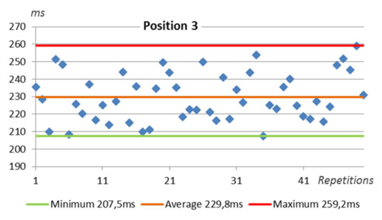 Operation time for the chronometric selectivity in position 3. The y axis is the time in ms. The x axis is the number of repetitions.