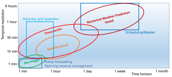 Figure 2 summarizes the best usage domains for each of the main existing methods (Time series, Numerical Weather Prediction, satellite and image based methods) according to the forecasting time horizon and the temporal resolution. For example, the bottom left corner represents the high resolution and short term forecasts needed for management of the spinning reserve. The best suited algorithms use image recognition from cameras pointed at the sky to predict the cloud position and infer the future PV production.