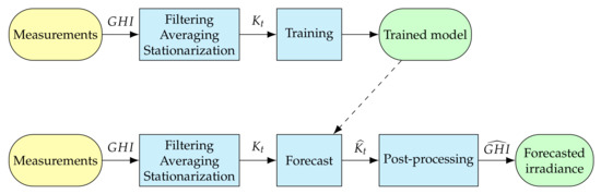 28]. According to this requirement, the irradiance time series is made stationary during the data preprocessing phase. To do so, the measured irradiance is divided by the theoretical irradiance under clear sky conditions. Several clear sky models exist in the literature [
