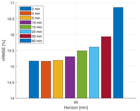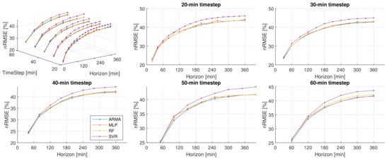 Each of the selected models is configured with a maximum horizon of 6 h and for time-steps of 10, 15, …, 60 min. Those models are trained over a year and then tested on two years. This gives 11 series of nRMSE values, one for each time-step length containing the error for each horizon. The series do not have the same number of points: the one corresponding to a 10-min time-step has 36 values and the one corresponding to a 60-min time-step has only 6. To ease the graphic representation, all the values are interpolated to match the 10-min time-step series.