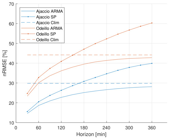 Figure 5 compares the results for a 30 min time-step in the two locations. As expected, the forecast error increases with the horizon for ARMA and Scaled Persistence models and it is lower in Ajaccio than in Odeillo due to the high variability of the irradiance in mountain areas. This is consistent with the results in [