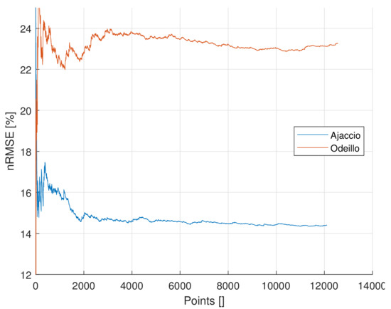 To plot this figure, the errors are taken in random order, then the cumulative nRMSE is computed. This means that 2000 points on the horizontal axis correspond to 2000 points taken randomly in the two-year test period. If they had not been randomized, the first 2000 points would have corresponded to the start of the test period and then depended on seasonality variation. The metrics convergence is a complex problem and will not be further detailed in this paper and will be subject to future works.