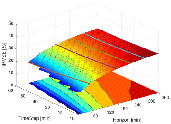 25]. That is the reason why the present paper aims to compare, on the same location and with the same forecast model, the forecast error at different horizons and time-steps.