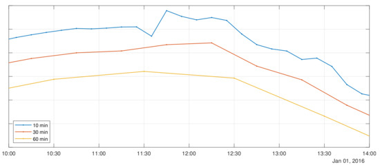 Figure 9, where the look of an irradiance measurement is plotted with averaging window lengths of 10, 30 and 60 min. The 60-min window plot is “smoother” and closer to the data trend than the algorithm tends to forecast.