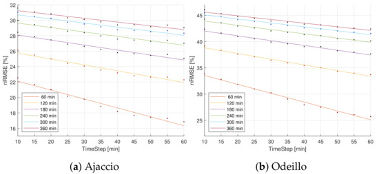 The results differ for each horizon. For short term horizons, increasing the resolution has a significant effect on the error: for example, in Odeillo at 60 min, a 10-min reduction in the time-step results in a 1.7% nRMSE increase. This is less pronounced for long term horizons; e.g., 0.8% per 10 min at 6 h in Odeillo. As mentioned before, the nRMSE is lower in Ajaccio. The trade-off between resolution and error is similar; however, the coefficients are slightly lower.