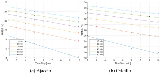 Figure 5, can still be seen. The novelty here is the slight reduction of the nRMSE when the time-step increases. The short term unpredictable variations of the irradiance are indeed smoothed by the averaging, leading to a smaller variability and an “easier” forecast. This is illustrated in