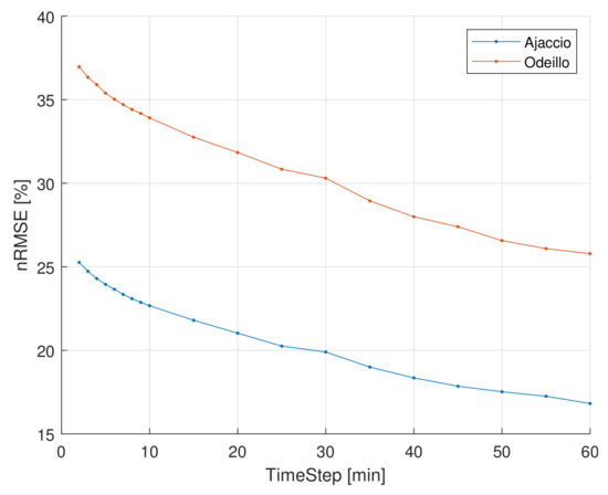 Figure 13. As stated before, small steps models can better estimate the average irradiance for the next hour. In the case of Ajaccio, reducing the time-step from 60 min to 5 min offers a 1.6% reduction of the nRMSE. However, going below 5 min does not improve the forecast accuracy. Yet for longer horizons this improvement is less significant.