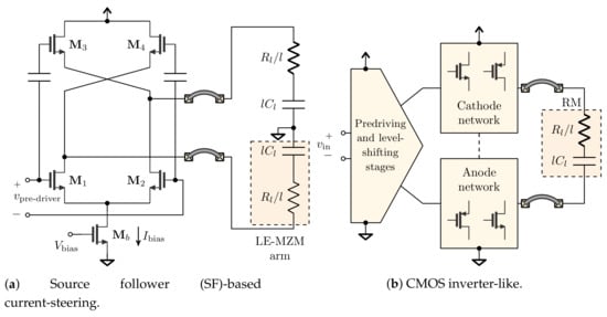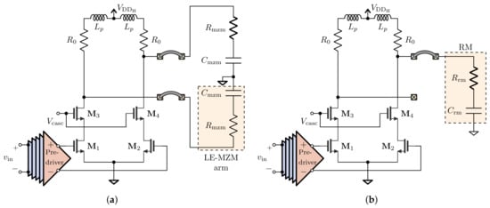 - Rakowski, M.; Ryckaert, J.; Pantouvaki, M.; Yu, H.; Bogaerts, W.; de Meyer, K.; Steyaert, M.; Absil, P.P.; Van Campenhout, J. Low-Power, 10-Gbps 1.5-Vpp differential CMOS driver for a silicon electro-optic ring modulator. In Proceedings of the IEEE 2012 Custom Integrated Circuits Conference, San Jose, CA, USA, 9–12 September 2012; pp. 1–6. [Google Scholar] [CrossRef]