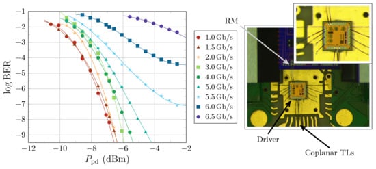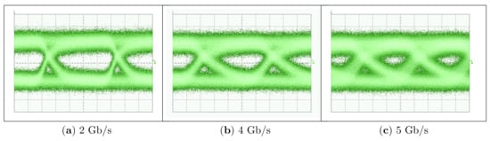 - Sedighi, B.; Christoph Scheytt, J. 40 Gb/s VCSEL driver IC with a new output current and pre-emphasis adjustment method. In Proceedings of the 2012 IEEE/MTT-S International Microwave Symposium Digest, Montreal, QC, Canada, 17–22 June 2012; pp. 1–3. [Google Scholar] [CrossRef]