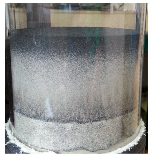 There are numerous known air classification devices. The choice of its type depends on properties of the separated materials [32]. Fluidised bed classifiers could be applied to the cenospheres’ recovery from fly ash. The main issue with the fluidisation of fly ash is the formation of agglomerates of fine particles due to adhesion. There are various methods to enhance the fluidisation of ultrafine particles, among them the addition of foreign particles [33]. The currently applied technique proposed by Ramme et al. [30], that makes it possible to effectively fluidise the fly ash, is connected with the dry sieving of fly ash below 38 µm, which is highly ineffective. Other popular devices that could be used for the division of the classified material into two fractions are centrifugal air classifiers (like the rotor classifier [28,34] or circulating air classifier [35,36]). However, for the cenospheres’ recovery from fly ash, it would be more favourable to obtain a series of fractions due to the possibility of overlapping fine fly ash particles with larger and lighter cenospheres. An example of such a device is the gravitational-crossflow zone classifier, which has already proved its performance in the simulated recovery of cenospheres using 1:1 fly ash–cenospheres mixture [37].