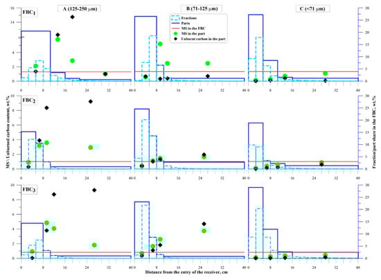 Newton’s efficiency (Equation (4)) had a positive value in reference to selected products of pneumatic separation, showing a MS content greater than that found in the FBCs (Table 3, Table 4 and Table 5). It is clearly shown in Figure 4, where only some FBCs parts have a MS content (green dots) higher than in the initial FBCs (red line). Grain fractions of FBC2 and FBC3 had similar distributions of floating unburnt carbon and MS: fractions A had the maximum MS contents in fractions located around 8–10 cm from the entry of the receiver, while the highest char contents were obtained for the last (IV) parts. In fractions B and C, contents of MS and char were correlated and similar in value. FBC1 is characterized by different distributions of unburnt carbon and MS (except for the fraction C). The reason for that were higher MS content, lower char content and different partitions of the fractions into final parts in comparison to the FBC2 and FBC3.