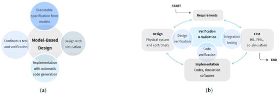 In recent years, complexity and interoperability requirements of industrial products and systems, have seen a significant increase. This has led to new challenges in both design and development of innovative and competitive solutions. High-tech, automotive, and aerospace industries, have been among the firsts to apply a model-based design (MBD) approach, exploiting information technologies and CAD models [1] to assist designers in every stage of the development process [2]. The main idea behind the MBD is the development of a complete system in a virtual environment, to reproduce the expected behaviour of the real system, and to predict its performances before the building. Some examples of MBD application are experienced for propulsion plant control purposes [3,4]. Figure 1a summarizes the main aspects of the MBD philosophy. More specifically, the workflow can be described in four points: (I) requirements collection; (II) physical system and control definition; (III) verification and validation; (IV) test, performed with hardware-in-the-loop (HIL) setups. As depicted in Figure 1b, these main points are not necessarily sequential, since the continuous verification after each step is the key aspect of the MBD design procedure. Several variations of this general structure are available in literature, e.g., the V-model approach is often used. It consists of an iterative process, typically used for software development and now also for microgrid design, which associates at each development step a specific test phase for validation [5,6].