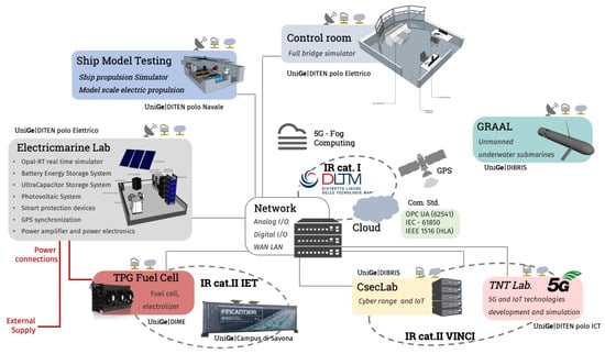 As it is clearly depicted in Figure 2 the laboratory is equipped with different simulators and facilities. In particular the Opal–RT simulator is connected to a power converter sized 15 at can provide an active front-end and a DC bus where it is possible to connect Lithium-ion battery and other DC sources. The ShIL infrastructure is composed of: four-quadrant power converters connected to Opal–RT simulator, storage systems, 5 fuel-cell, ship bridge simulator which replicates ship dynamics and human interaction, 5G and telecommunication simulators.