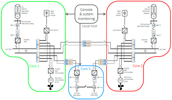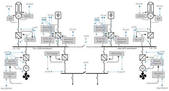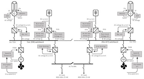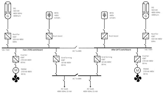 The electrical system is symmetric, each main bus presents a diesel generator (DG) connected to the main switchboard with an active rectifier, a battery energy storage system (BESS) interfaced with a DC-DC two quadrants converter, a propulsion system drive, a PMSM and propeller. Additionally, each DC bus bar presents a grid-forming inverter for the supply of the AC distribution system. Both the DC and AC systems are symmetric, and they could be connected alternatively, through a DC tie breaker or an AC tie breaker. Figure 3 shows the system one line diagram.