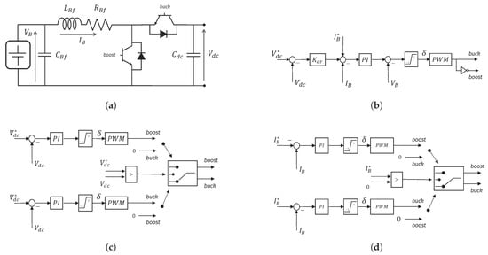 (a) Battery DC-DC circuit diagram. (b) DC voltage droop control, (c) DC voltage forming control, (d) battery current control.