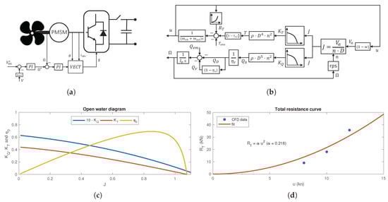 (a) Propulsion system layout; (b) propulsion plant model; (c) propeller open water diagram and (d) ship hull total resistance curve.