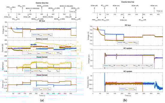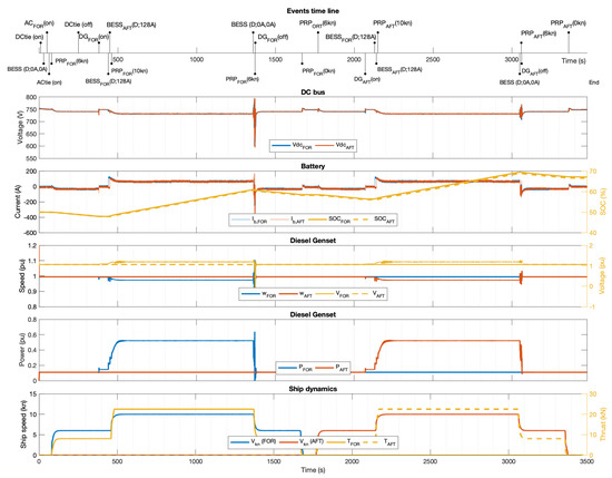 All the devices in the microgrid operate to the system regulation which different strategies. Figure 10a shows the results of a simulation in which the different DC bus control strategies are exchanged. In the top graph of Figure 10a, the timeline of the different events is described. The initial configuration considers the two batteries, cooperating in droop control scheme to the regulation of the two DC switchboard connected by the DC tie breaker. Then, the two buses are disconnected, the ships accelerate to a speed of 6 and the two DGs are connected to the DC buses. At 180 the two DC buses are connected again and BESS control test starts. Firstly, some set points are driven to the BESSs which operates in droop control scheme. Then, at 350 the battery control strategy is changed to current control mode. In this configuration the BESS current is controlled directly and the voltage regulation is left to the DGs. With this control mode some set points are sent to the BESS controllers and finally at 500 the BESS droop control strategy is restored. For the last tests, the two DGs and the FOR BESS are disconnected. In this configuration, the AFT BESS is the only resources left to feed the propulsion system in voltage forming control mode. Below of the time line plot in Figure 10a, some measurements are shown, such as, DC voltage at the two main busbars, batteries current and state of charge, generators speed and voltages and finally, generator powers.