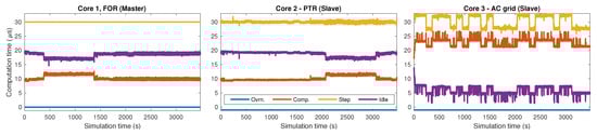 The practical implementation of the model in Opal-RT is described in Figure 9. The simulation uses the computational power of three cores, the base model is coded in Simulink environment using the SimPowerSystems blockset and the add-on advanced real-time electro-magnetic solvers (ARTEMiS) [55]. The solver is the the state-space nodal (SSN) algorithm, a delay-free solver provided with ARTEMiS [56].