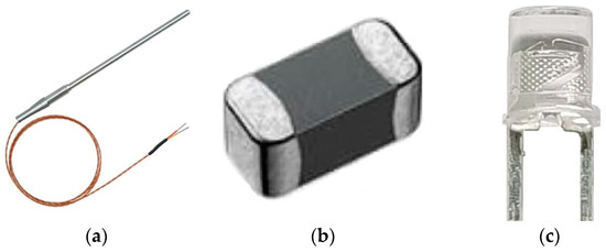 Figure 2 exhibits the conventional and proposed temperature sensors. Among the representative conventional temperature sensors, thermo-couplers show relatively high accuracy for temperature detection, but are expensive [19], while NTC thermistors are inexpensive but characterized by resistance that changes slowly at temperatures above 70 °C [20]. In contrast, the MIT sensor used in this study is inexpensive (made of VO2), and its resistance changes rapidly at temperatures above 70 °C [15,18].