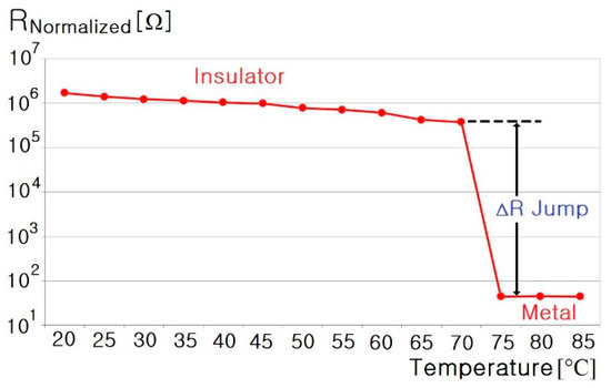 Figure 4 shows resistance measurement data at different temperatures for the MIT sensor invented at the ETRI. The resistance was evidently 372.1 kΩ at 70 °C and rapidly decreased to 44.49 Ω at 75 °C.