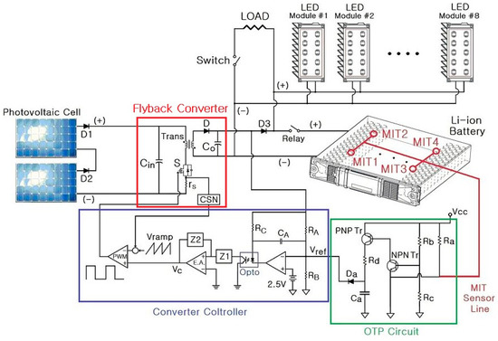 The MIT sensors can be placed at the desired position in the lithium-ion battery, and all the MIT sensors are connected in parallel. The proposed LED-battery power-conversion system in Figure 6 was designed to prevent the occurrence of explosions and fires because of over-temperature in the lithium-ion battery. It is based on the control of the flyback converter’s output. Power generated from the solar cell charges the lithium-ion battery of the flyback converter, and the battery supplies power to LED modules #1 to #8 and the load (LOAD). The MIT sensors (MIT1 to MIT4) detect the temperature of a specific part of the lithium-ion battery, and the OTP circuit detects the reference voltage (Vref) when over-temperature occurs. Vref of the flyback converter controller is controlled to be 2.5 V. However, when over-temperature occurs, the voltage applied to the OTP circuit Vcc rises to 12 V. At this voltage, the flyback converter controller does not generate a gate signal, resulting in the operation of the converter being terminated.