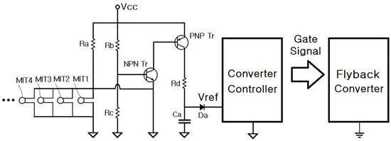 The NPN transistor cannot be turned on up to a temperature of 70 °C. Consequently, the PNP transistor connected to the collector terminal of the NPN transistor can also not be turned on. Therefore, since the OTP circuit does not generate any voltage with capacitor a (Ca) and diode a (Da), Vref is 2.5 V, which is generated by the flyback converter controller. At temperatures above 70 °C, the resistance of the MIT sensors decreases rapidly from 372.1 kΩ to 44.49 Ω. Therefore, the voltage at any point between Ra and the MIT sensors is almost 0 V. Consequently, the voltage applied to the emitter terminal of the NPN transistor is 0 V, and a voltage of 6 V is applied to the base terminal. The condition of Equation (1) is then satisfied, and the NPN transistor is turned on. This leads to Vcc = 12 V turning on the PNP transistor and Ca being charged at 6 V through resistor d (Rd).