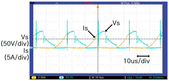 Voltage (Vs) and current (Is) waveforms of the main switch (input 40 V, output 27 V/0.5 A).