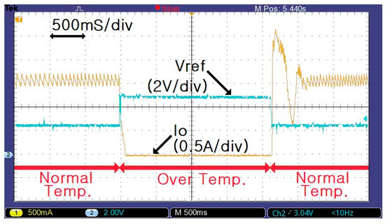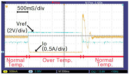 Figure 11 and Figure 12 show the waveforms of Vref and the output current of the flyback converter (Io) (0.8 and 1.5 A, respectively) when the temperature of the MIT sensor changed from a normal temperature to over-temperature, which is characterized by a sudden increase in Vref. The over-temperature of 70 °C increases the reference voltage rapidly and reduces the output of the flyback converter to zero.