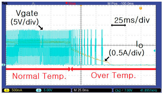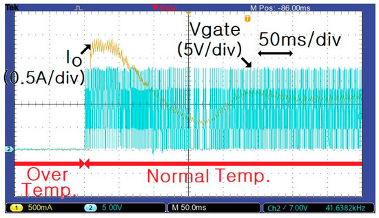 Figure 13 shows the Vgate of S and the Io waveform for an output current of 1.2 A when normal temperature changes to over-temperature. When over-temperature occurs, the duty cycle of Vgate decreases drastically, and Io decreases from 1.2 to 0 A.