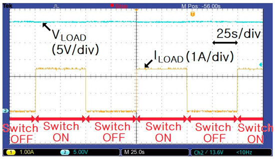 Figure 15 shows the voltage (VLOAD) and current (ILOAD) waveforms for changes in the load (2.5 A). Clearly, VLOAD (or battery voltage) is 27 V, even for a load of 15 Ω. Thus, it was confirmed that the proposed LED-battery power-conversion system stably follows load fluctuations.