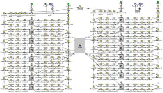 The working process of the diesel engine is complicated. It involves multiple physical and chemical processes such as fuel injection and evaporation, air-fuel mixing, combustion, intake, and exhaust flow [22,23]. To simulate this complex working process, a one-dimensional model of unsteady flow with conservation equations of mass, momentum, energy, and composition was established for the intake and exhaust systems of the diesel engine, and numerical method with finite volume was used to solve it. To improve the calculation accuracy of the TBCs of the intake, the exhaust, and the in-cylinder gases, the multi-zone model with a Woschni heat transfer model was used for the combustion processes. The graphical discrete data was input into the compressor module, and the establishment of the turbine module was based on the empirical formula of the flow rate and the efficiency changing with the expansion ratio. Therefore, the gas composition and engine performance parameters in the cylinder, exhaust pipe, and intake pipe were obtained from the model [24]. A professional engine working process simulation software GT-Power could solve the heat transfer laws of the multi-cylinder combustion process by defining appropriate combustion, and heat transfer modules, the transient temperatures, and heat transfer coefficients of the cylinder head’s flame surface, intake, and exhaust passages that were obtained. Through the diesel engine structural parameters and test data, the sub-models of the intake system, the valve system, the combustion chamber, the exhaust system, the crankcase, the injector, and the turbocharger were established, and the whole simulation model of the diesel engine’s working process is shown in Figure 1 by GT-Power software.