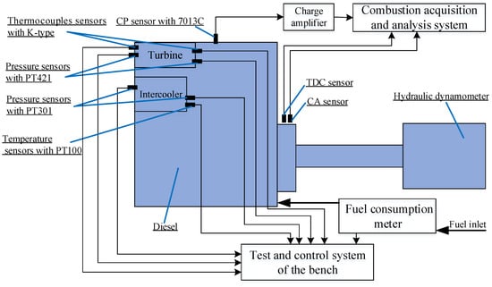 The routine test bench and measurement system of the diesel engine are composed as shown in Figure 2. The cylinder pressure (CP), top dead centre (TDC), and crank angle (CA) are measured through Kistler7013C sensor and 5018B charge amplifier and SZMB-18 magnetoelectric sensor with combustion acquisition and analysis system. The pressures before and after the intercooler are mainly obtained by the PT301 sensors, and the pressures of turbine inlet and outlet are mainly obtained by the PT421 sensors. The temperature after intercooling is measured by the PT100 sensor, and the temperatures before and after the turbine are measured by K-type thermocouples sensors. The fuel consumption rate of diesel engine is obtained through a fuel consumption meter and hydraulic dynamometer. All of the physical parameters above are collected, converted, and analyzed by the test and control system of the bench.